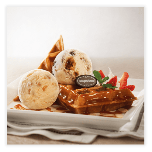 바닐라 캐러멜 브라우니와 마카다미아 넛 아이스크림을 따뜻하게 구워진 와플 & 카라멜 소스와 함께 달콤하게 즐길 수 있는 메뉴